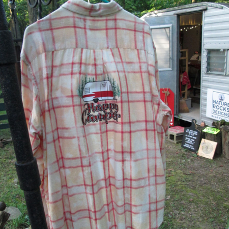 Vintage flannels – bleach dyed with Happy Camper graphic on back